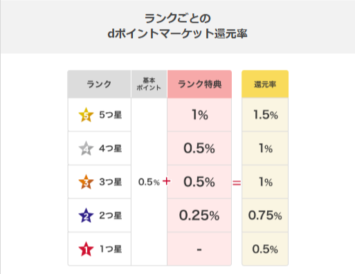 ドコモのdポイントクラブの会員ランクによって、さらに最大+1.0%のボーナスが付き、合計で1.5%の還元を受けられます。