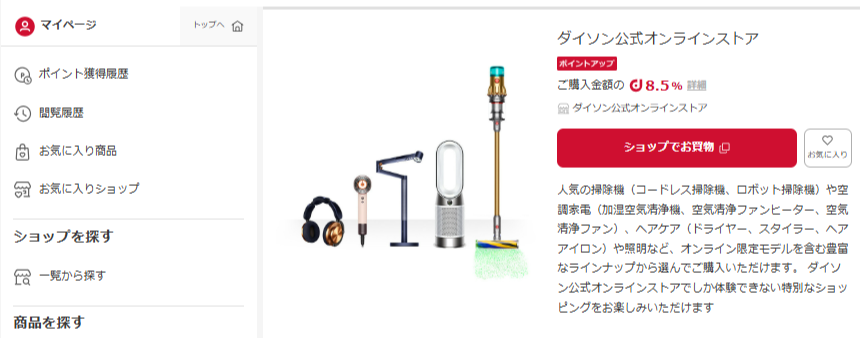 2025年6月時点では写真の通り、購入金額の8.5%分のポイントがもらえます。例えば、50000円分のダイソン製品を購入すると、4250円分のポイントがもらえるということになります。