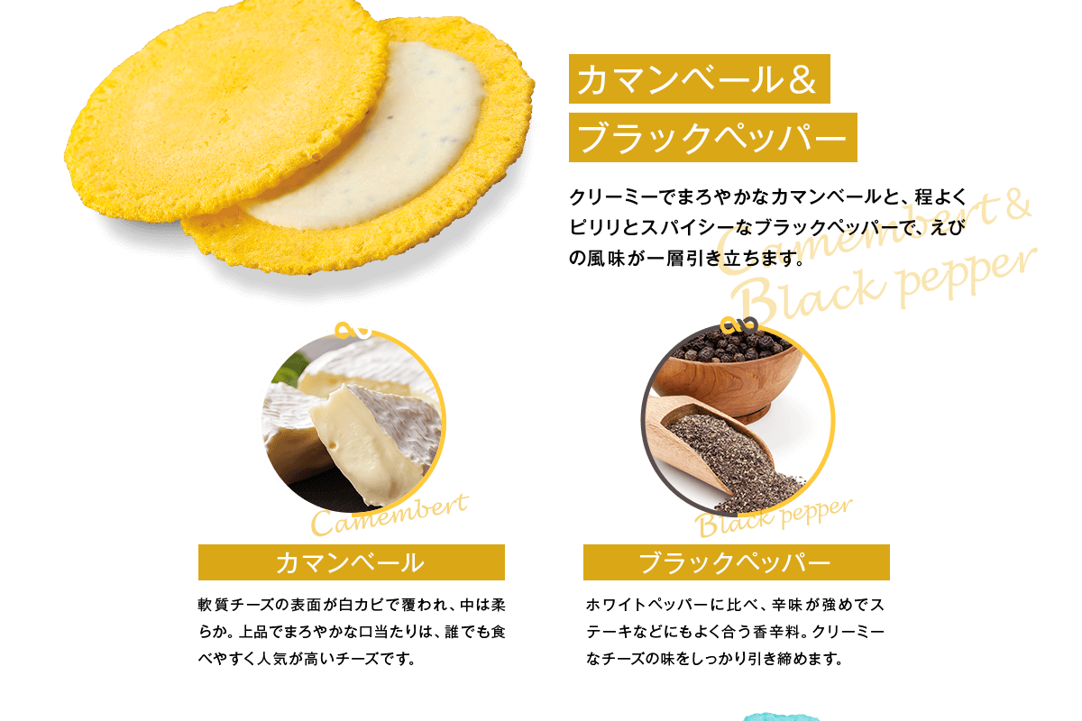 「クアトロえびチーズ」は、えびせんべい専門店・志満秀(しまひで)が手がける人気商品。パリッと軽い食感のえびせんに、チェダー、カマンベール、モッツァレラ、ブルーチーズといった個性豊かな4種のチーズをサンドしています。